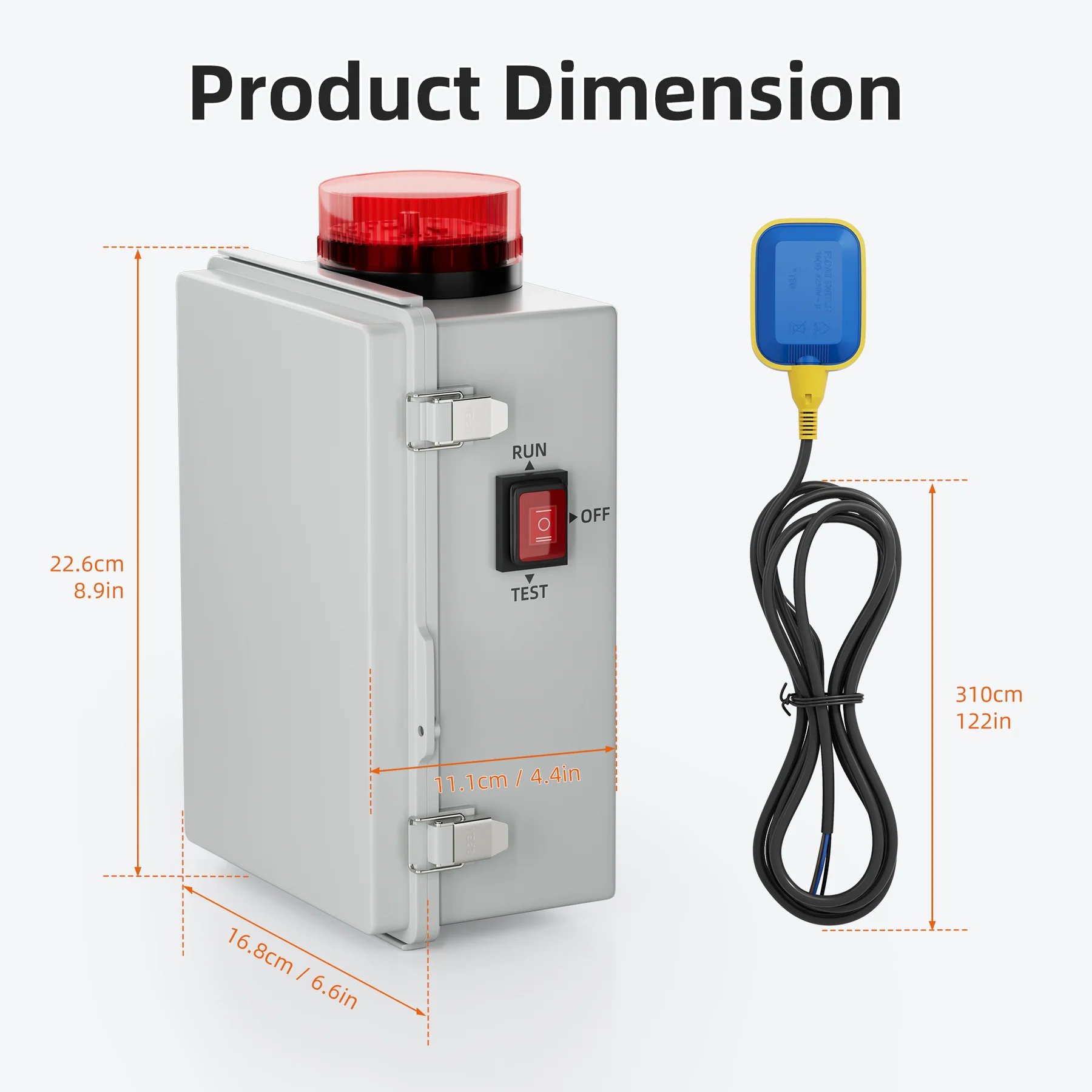 【Aviso de inundação precoce com um poderoso alarme】- Este alarme da bomba do poço foi projetado para alertá-lo rapidamente sobre possíveis inundações. A luz de alarme de alta iluminação oferece um poderoso alarme visual (≥110dB), tornando-o facilmente perceptível, mesmo em ambientes barulhentos.