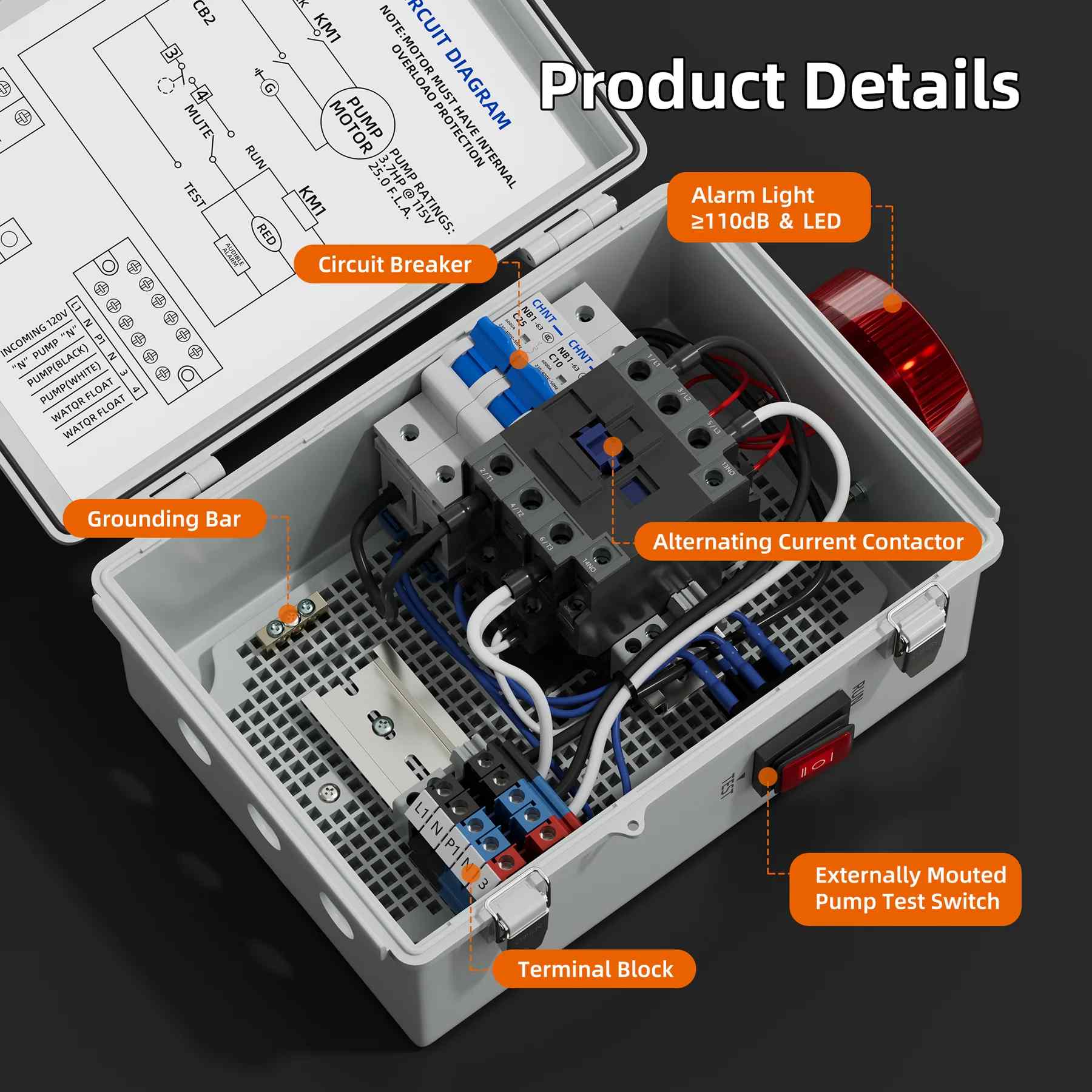 【Circuito abrangente e instalação fácil】- Este controlador de alarme e bomba oferece todos os componentes necessários para uma instalação completa. O sistema inclui um interruptor de teste de bomba externo, um contator de corrente alternado, uma barra de aterramento e um bloco de terminal, conforme mostrado no diagrama. Os componentes fornecidos e o diagrama de circuito incluído (visível nas imagens) suportam uma instalação fácil.