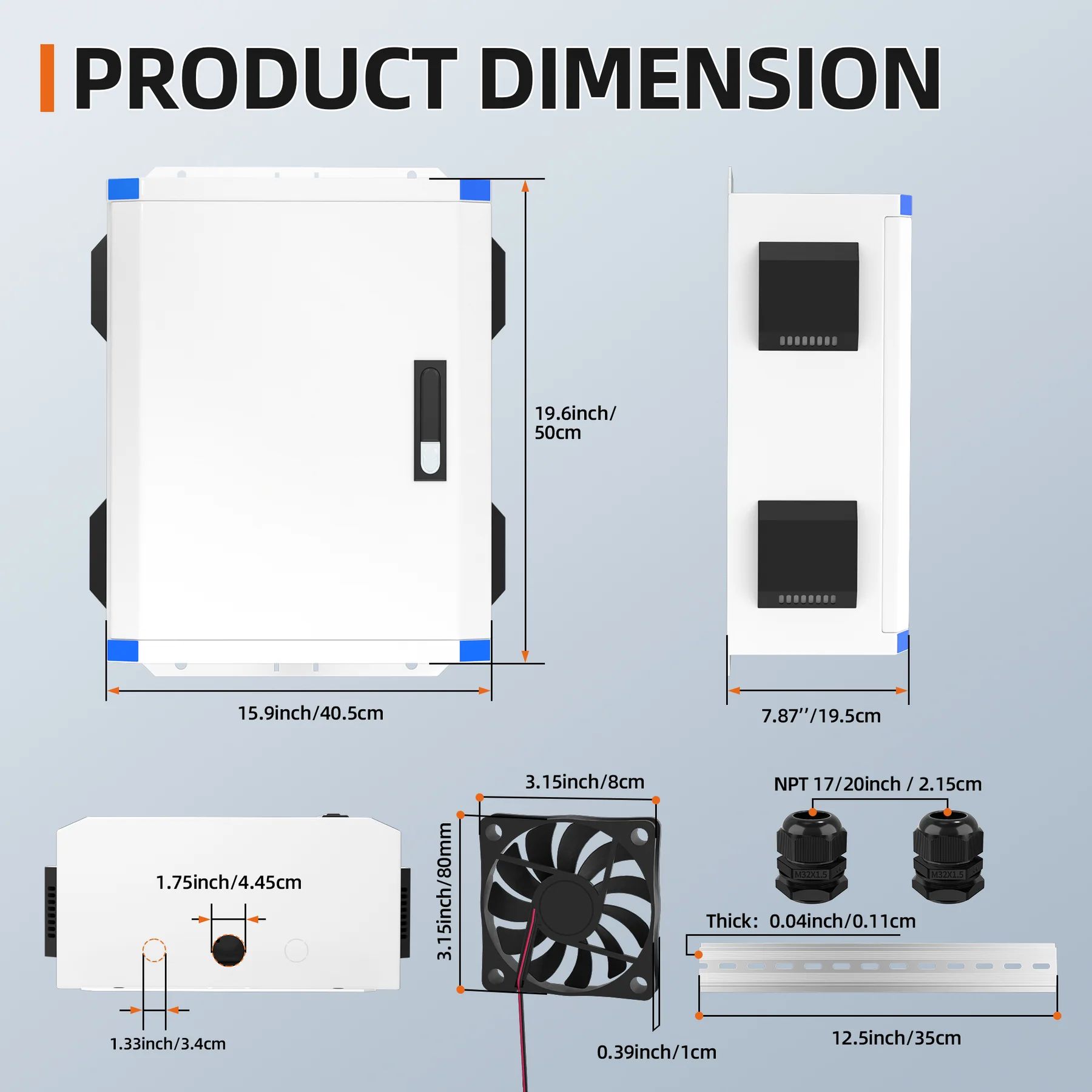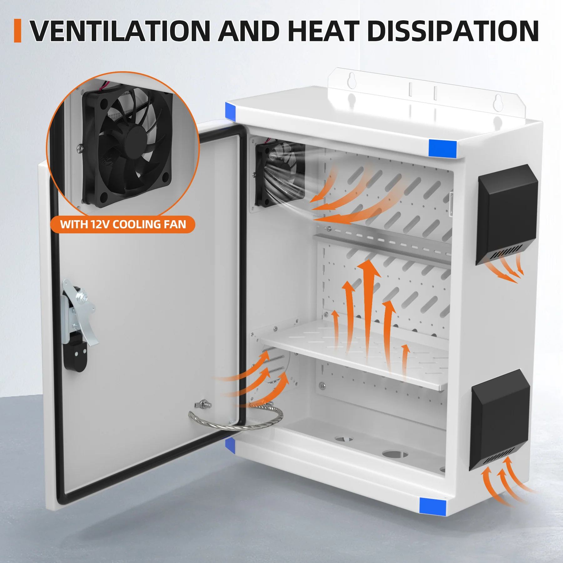 【Dissipação de calor eficiente】- A caixa de junção foi projetada para gerenciamento térmico ideal. Ele está equipado com um ventilador de refrigeração de 12V (80x80x10mm) e inclui dois slots de ventilação de cada lado para facilitar o fluxo de ar eficiente. Essa combinação de recursos garante que o calor gerado pelo equipamento interno seja dissipado de forma rápida e eficaz, impedindo o superaquecimento.