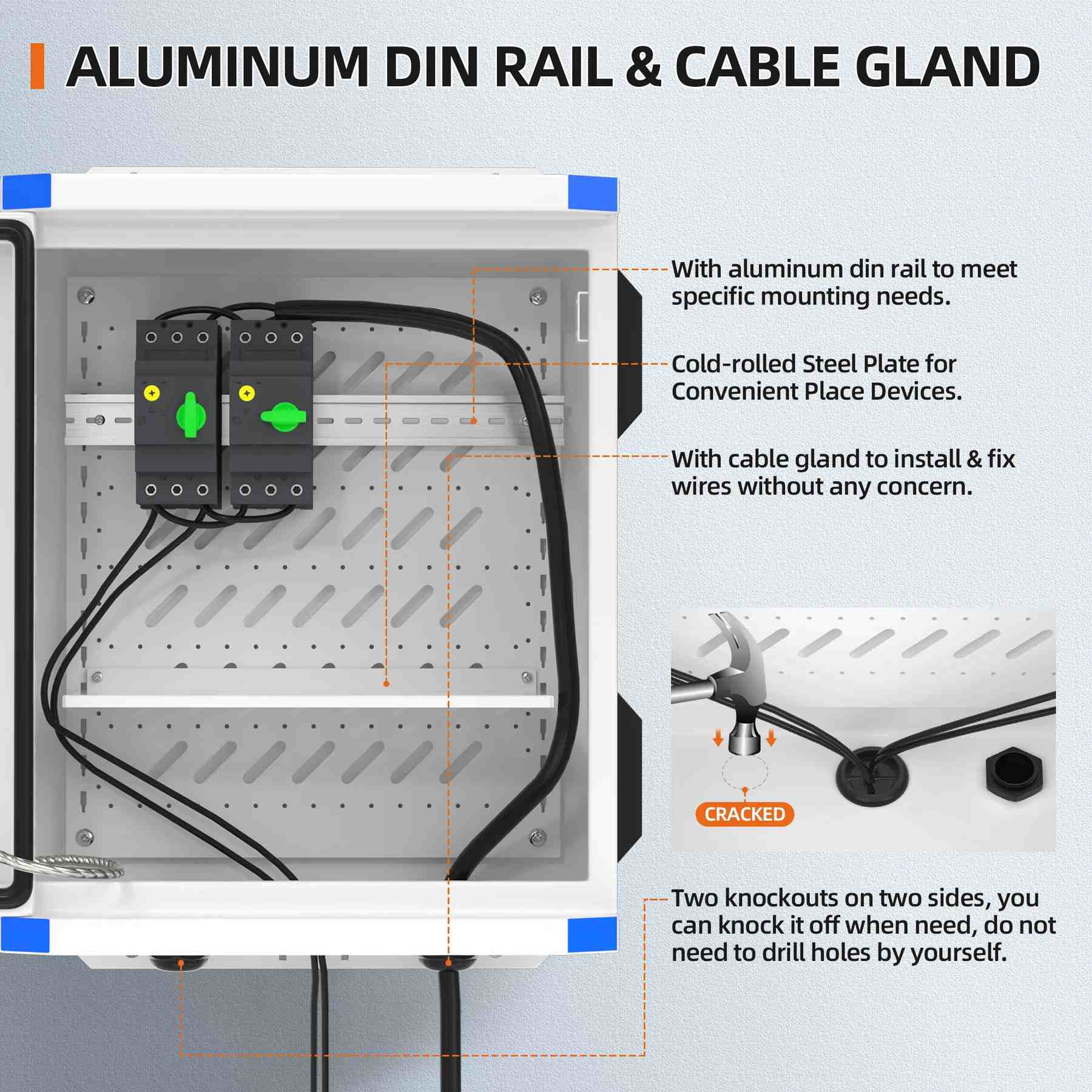 【Instalação fácil e versátil】- O gabinete possui dois orifícios de nocaute pré-cortados na parte inferior, simplificando a entrada do cabo e eliminando a necessidade de perfuração manual. Ele também inclui hardware e argolas de montagem em aço inoxidável, permitindo que os usuários escolham entre configurações de montagem na parede ou montagem de postes para opções de instalação versáteis.