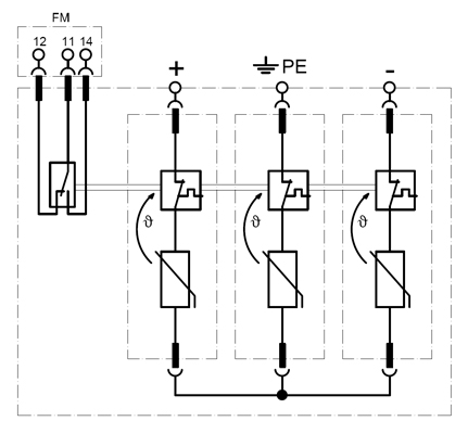 Este dispositivo de proteção de pura CD tipo 2 (SPD) protege sistemas sensíveis de energia CC de sobretensões transitórias no limite LPZ 0B - 1 e além. Um contato integrado de mudança remota (FM) permite a sinalização direta de status/alarme para PLCs, BMS ou SCADA, apoiando manutenção proativa e notificação rápida de falha.